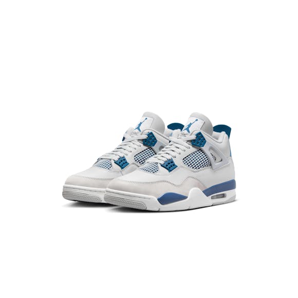 Step into a classic. The beloved AJ4 returns in premium Off-White leather, Neutral Grey nubuck and striking hits of Industrial Blue—creating an overall clean aesthetic. Staying true to form, we reengineered this icon back to its original ’89 specs with all the signature trimmings: a bold Jumpman logo, netting accents, the famous "wings" and Nike Air branding on the heel to finish off the heritage appeal.