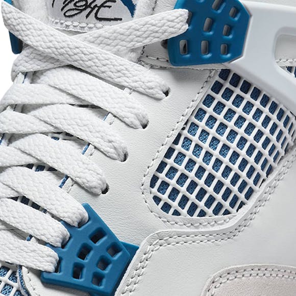 Step into a classic. The beloved AJ4 returns in premium Off-White leather, Neutral Grey nubuck and striking hits of Industrial Blue—creating an overall clean aesthetic. Staying true to form, we reengineered this icon back to its original ’89 specs with all the signature trimmings: a bold Jumpman logo, netting accents, the famous "wings" and Nike Air branding on the heel to finish off the heritage appeal.