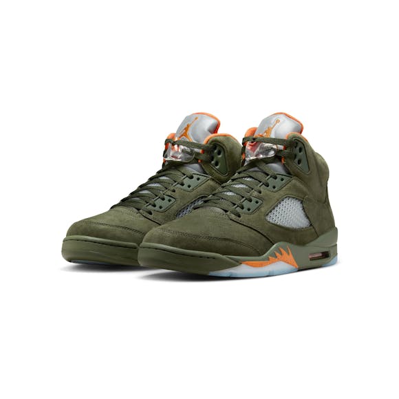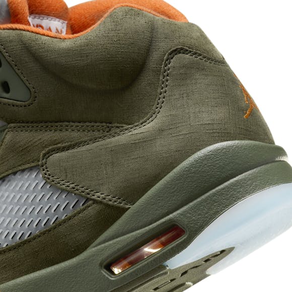 Step into a classic. The AJ5 returns with premium materials and a mix of Army Olive, Cargo Khaki and pops of Solar Orange to balance out the earthy palette. It maintains the signature midsole, vented panels and Metallic Silver Jumpman logo making it an instant icon. To finish it off, lace locks and an icy translucent outsole keep your look rooted in the spirit of '90s hoops.