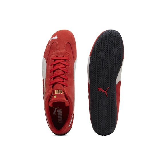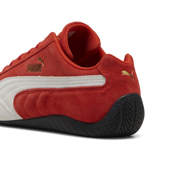 An icon of racing culture, the PUMA Speedcat has been synonymous with speed, precision, and unparalleled performance for over 25 years. It originated as a fireproof Formula 1® footwear style, but over the decades it found itself on a new circuit – transcending the tracks of Monaco for the streets of global fashion capitals. Wrapped in soft suede and premium leather, this silhouette is reissued in its original red and black colorways with a new PUMA Cat Logo at the front.