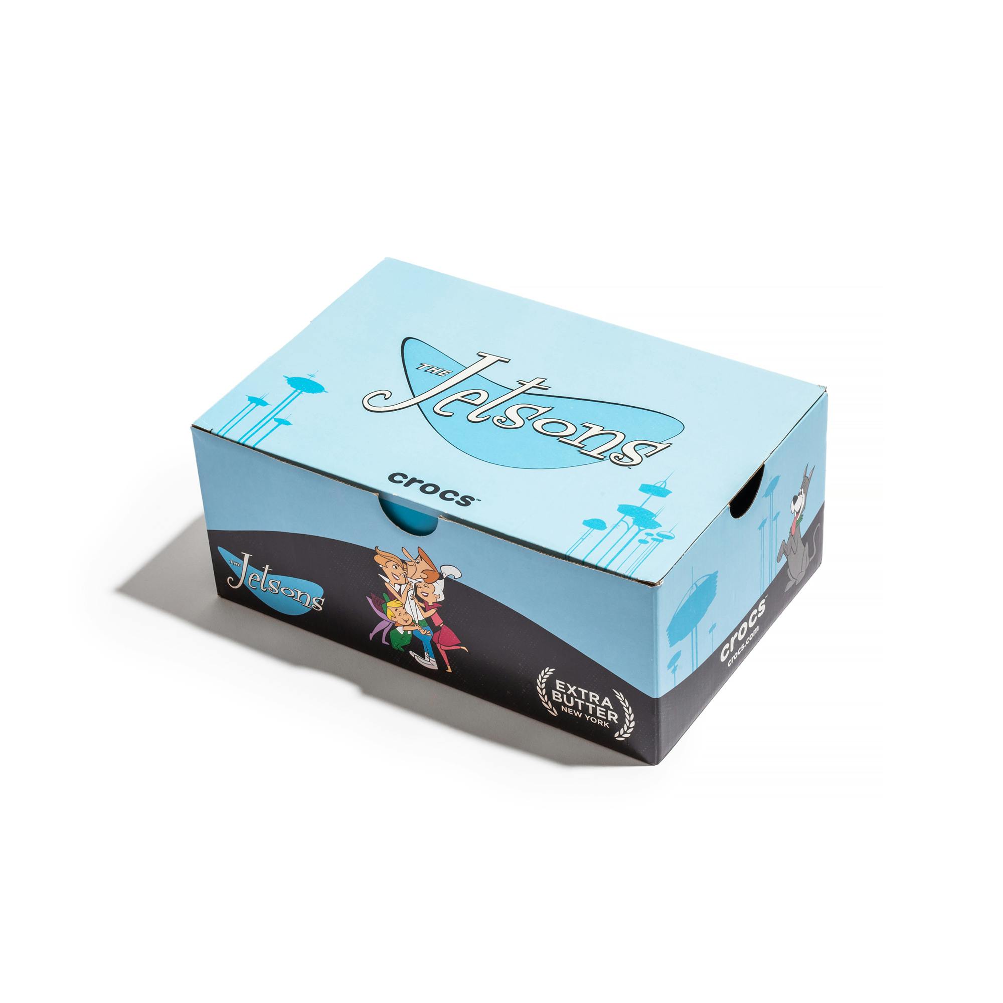 Design inspiration for the Echo Clog, one of Crocs’ newest model styles, is taken directly from the setting of The Jetsons’ Orbit City. The molded shoe is taken over by a space-age green colorway, contrasted by a pop of blue in the co-branded footbed. The design comes to life with 3D-molded Jibbitz of the flying car, the Skypad apartment building. Additional custom rocket booster Jibbitz were attached to the heel strap. Each pair will be packaged in a custom, retro-graphic box.