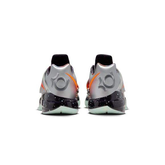 Taking it back to 2012, the KD 4 "Galaxy" returns for another moonshot. The metallic and orange combo stays true to the original design, drawing inspiration from astronaut suits and galactic exploration. Zoom Air in the forefoot brings the bounce, and the adjustable strap helps lock you in. And with special edition details like a speckled, starry-sky midsole and space mission patches, this KD 4 is ready for liftoff.