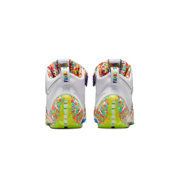 Jump start your day. From its milk white upper to its Fruity PEBBLES graphics (the King’s favorite cereal), these shoes sweeten any outfit. "FAMILY SIZE" on the pull tabs honor those who’ve been with you from the beginning while vibrant colors on the outsole nourish your eyes. What are you waiting for? Get out of bed, open a shoebox and start your day with force.